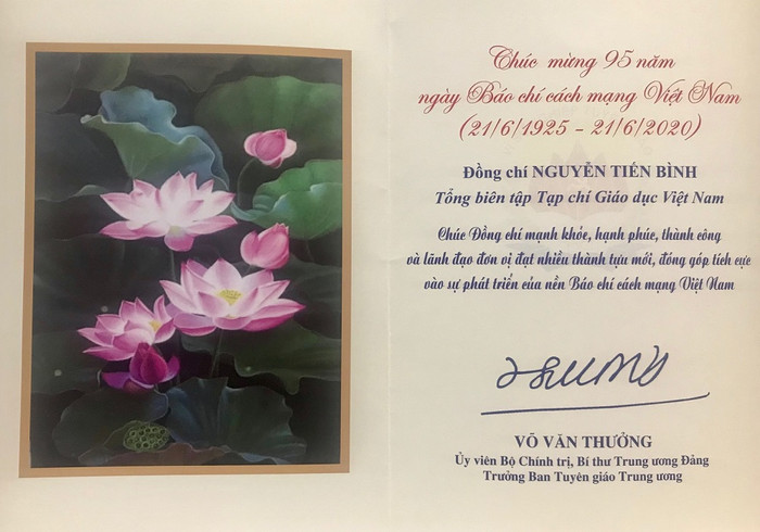 Vào dịp kỷ niệm 95 năm Báo chí cách mạng Việt Nam (21/6/2020), Tạp chí điện tử Giáo dục Việt Nam vui mừng nhận được lời chúc của đồng chí Võ Văn Thưởng - Ủy viên Bộ Chính trị, Bí thư Trung ương Đảng, Trưởng Ban tuyên giáo Trung ương; Lãnh đạo Ủy ban Quản lý vốn Nhà nước; Hiệp hội Các trường đại học, cao đẳng Việt Nam; Bộ Giáo dục và Đào tạo; Đảng ủy Khối doanh nghiệp quận Cầu Giấy; Công an Thành phố Hà Nội; quý nhà trường, nhiều đơn vị và quý độc giả...