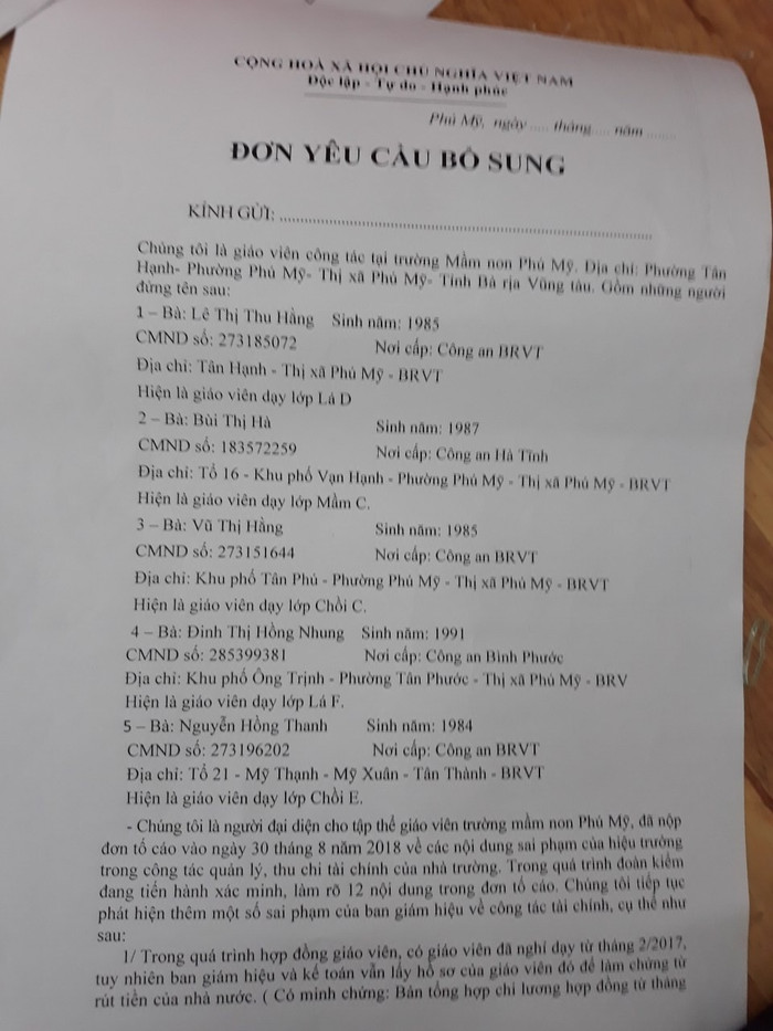 Cách đây khoảng 2 tháng, 11 giáo viên Trường Mầm non Phú Mỹ tỉnh Bà Rịa Vũng Tàu đã viết đơn kiện hiệu trưởng nhà trường vi phạm 12 nội dung liên quan đến thu chi, an toàn vệ sinh thực phẩm… Ủy ban nhân dân thị xã Phú Mỹ đã cho thanh tra và kết luận những tố cáo của giáo viên (có tố cáo đúng hoàn toàn, tố cáo đúng một phần…).