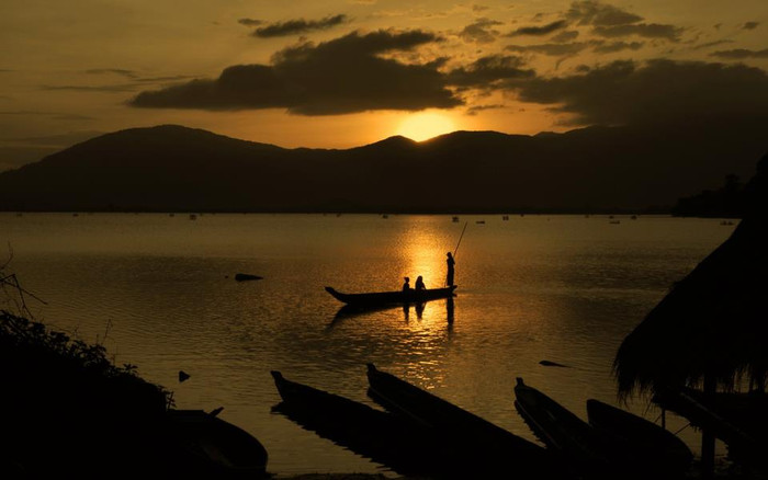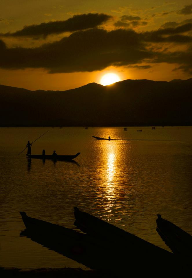 | Hồ Lăk - Buôn Mê Thuột, cảnh đẹp hoàng hôn, nước hồ lấp lánh như dát vàng |