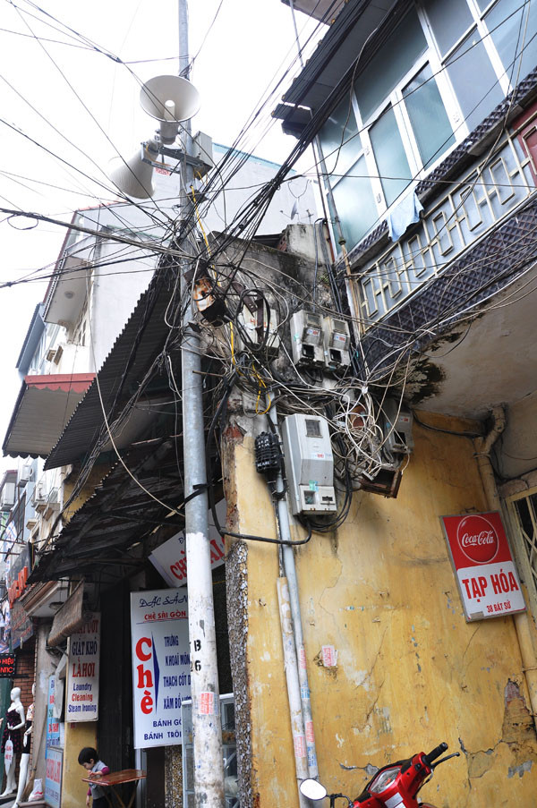| Ở phố Hàng Nón nhiều ngôi nhà mới được xây dựng, nhưng tình trạng dây điện trước nhà thì không có cải thiện gì. |