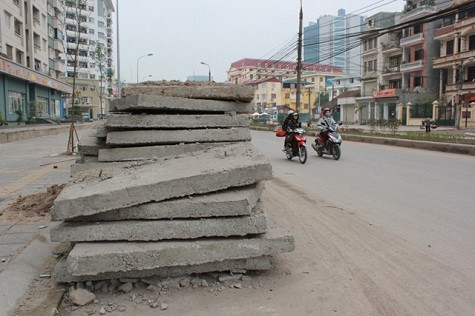 | Không những lô cốt mà cả cát và sỏi, đá đổ tràn lan gây bụi bẩn mất mỹ quan đường phố. |
