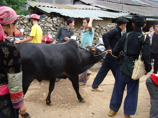 | Từ sáng sớm, người dân trong xã Lũng Phìn đã mang dắt những con thú mà gia đình nuôi được để đến chợ trao đổi, hoặc bán lấy tiền mua thực phẩm, quần áo. |