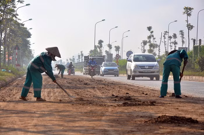 Trên nhiều tuyến đường vành đai như: Khuất Duy Tiến, Nguyễn Xiển, Đại lộ Thăng Long… vào mỗi buổi sáng. Các công nhân môi trường lại phải nạo vét bùn đất, cát đá vương vãi do các chủ phương tiện chở vật liệu trong đêm gây nên.