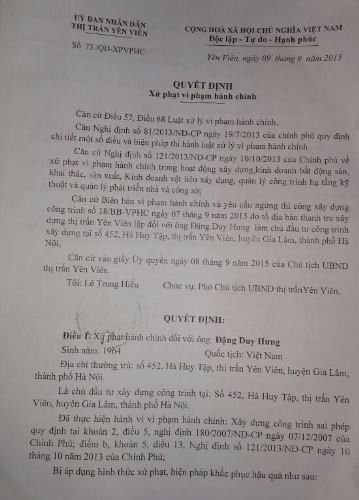 Ngày 16/7/2015, UBND huyện Gia Lâm đã cấp GPXD tạm số 236/GPXD-UBND cho ông Đặng Huy Hoàng và GPXD tạm số 235/GPXD-UBND cho ông Đặng Duy Hưng tại địa chỉ số 452 đường Hà Huy Tập (thị trấn Yên Viên)