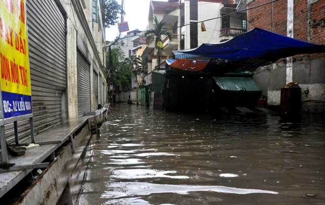 | Hàng chục hộ gia đình trong ngõ 42, Liễu Giai bị cô lập và ngừng buôn bán trong buổi sáng nay do nước ngập quá sâu. |