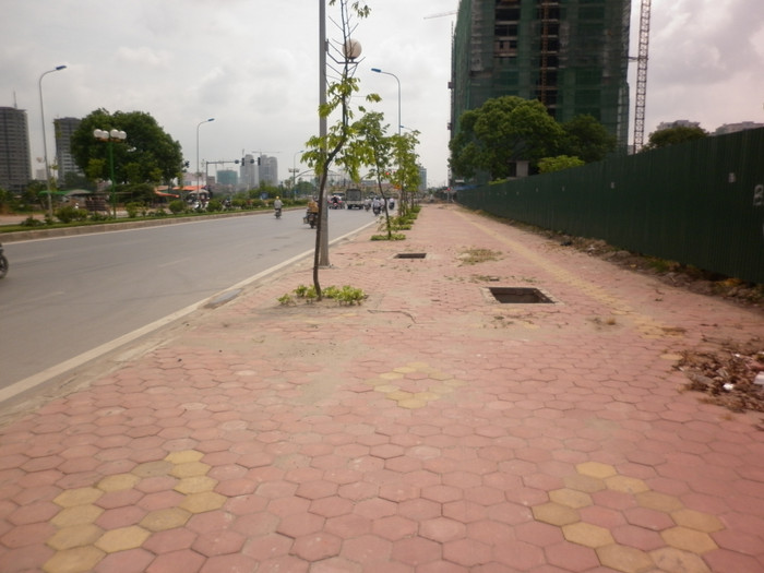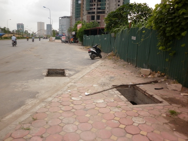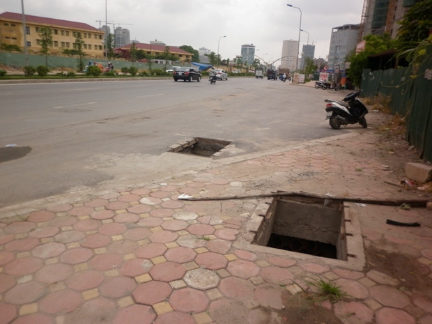 | Hố cáp mất nắp nằm chễm trệ giữa vỉa hè |