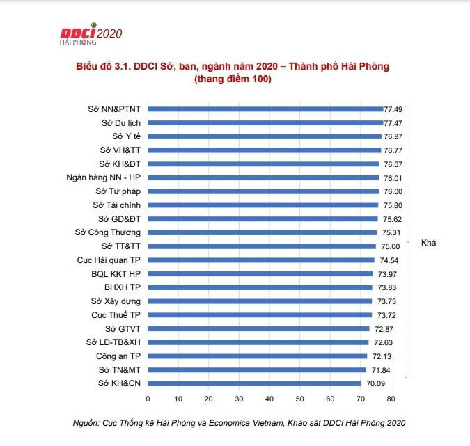 Trên bình diện chung toàn thành phố Hải Phòng, điểm số DDCI Sở, ban, ngành ghi nhận ở mức điểm “khá” với 74,66 điểm, góp phần khẳng định thêm nhận xét chung của các doanh nghiệp/hợp tác xã trên địa bàn thành phố trong năm qua.