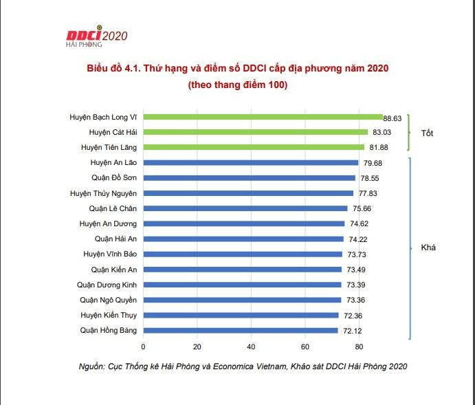 Đối với cấp quận, huyện, huyện Bạch Long Vĩ đã trở thành địa phương dẫn đầu bảng xếp hạng DDCI năm 2020 với 88,63 điểm, nhóm tốt. Đứng cuối bảng xếp hạng là quận Hồng Bàng với 72,12 điểm, nhóm khá.