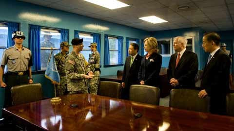| Các binh sĩ Triều Tiên quan sát Ngoại trưởng Hàn Quốc Yu Myung-hwan, Ngoại trưởng Mỹ Hillary Clinton, Bộ trưởng Quốc phòng Mỹ Robert Gates và Bộ trưởng Quốc phòng Hàn Quốc Kim Tae-young trao đổi với báo giới bên ngoài tòa nhà T2 ở Bàn Môn Điếm (bên địa phận Hàn Quốc, khu vực phi quân sự giữa Triều Tiên - Hàn Quốc). |
