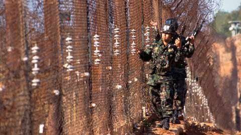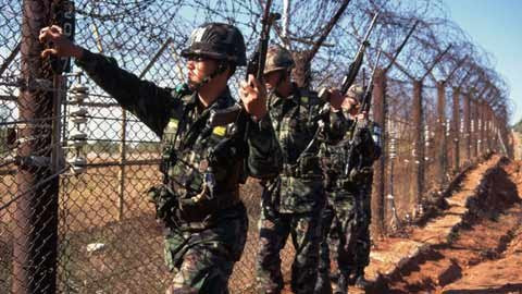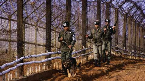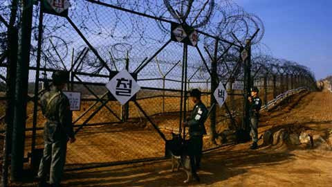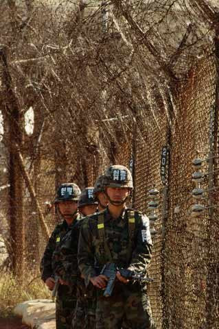 | Binh sĩ Hàn Quốc tại khu vực biên giới Triều Tiên - Hàn Quốc. Hàng rào sắt này kéo dài nhiều km trên khu vực phi quân sự giữa hai nước. |