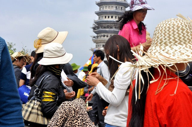 | Tại chân tượng Di lặc có vài chục người đổi tiền lộc, tiền lẻ, bán hương, chụp ảnh... “bủa vây” du khách khi tới đây. |