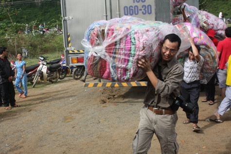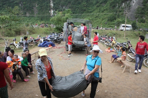 | Đoàn cứu trợ chuyển hàng cứu trợ xuống nơi tập kết để trao cho người dân |