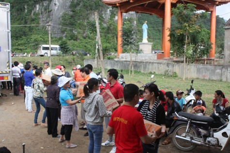 | Mặc dù vừa trải qua quãng đường hàng trăm km từ Hà Nội vào đến Quảng Bình nhưng những người trong đoàn cứu trợ vẫn hăng hái bốc hàng xuống khỏi xe để nhanh chóng trao cho người dân vùng lũ |