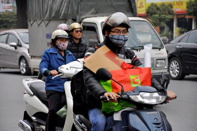 | Người đi một mình, người có cả gia đình trên một chiếc xe máy cùng với đồ đạc cồng kềnh phía sau. |