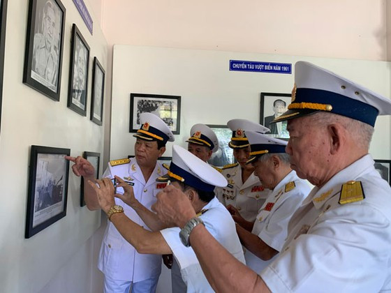 | Ông Đào Hồng Tuyển cùng các tướng lĩnh Đoàn tàu không số ôn lại kỷ niệm chuyến tàu đầu tiên rời Bến Tre ra Bắc nhận vũ khí. |