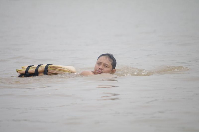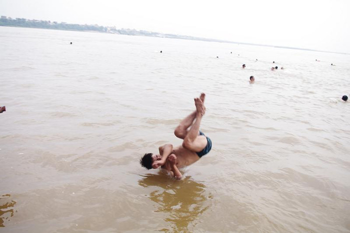 | Nhào ầm ầm từ trên chiếc thuyền xuống thằng dòng sông Hồng đang chảy xiết |