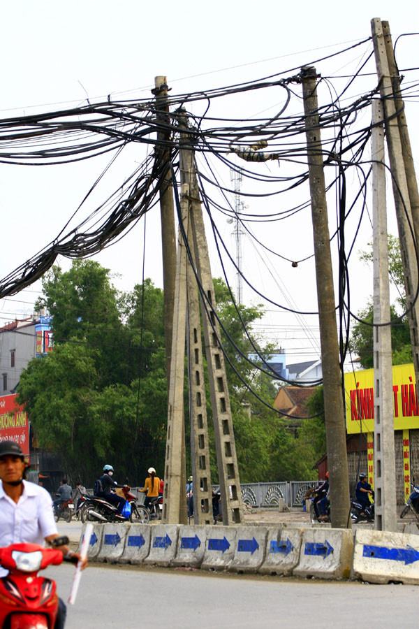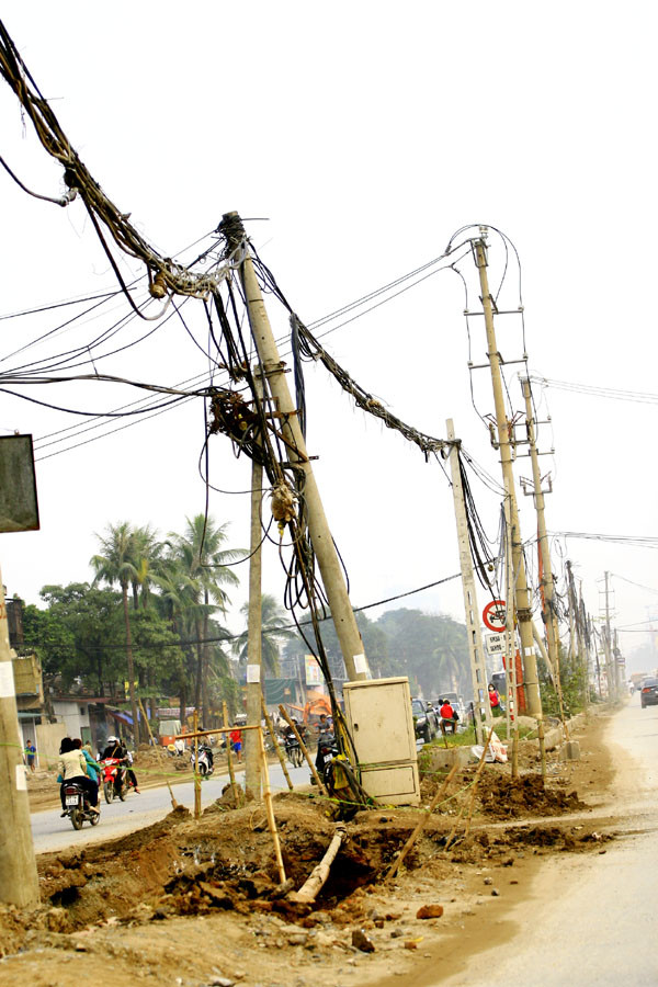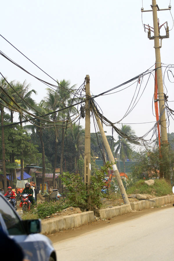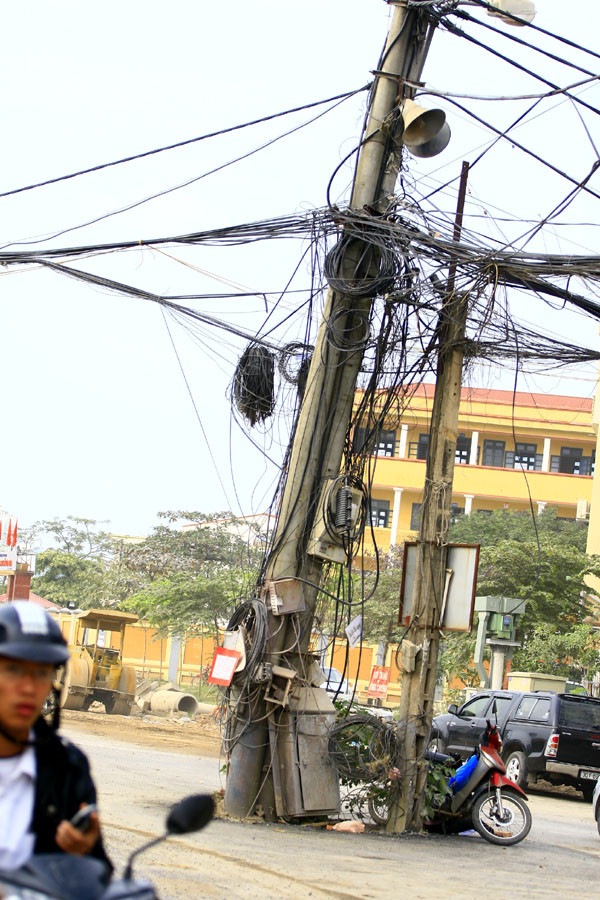 | Những chiếc cột điện ở phố Trung Kính mắc võng với dây cáp ngả nghiêng khiến ai đi qua cũng phải phát hoảng |