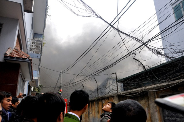 | Khói bốc ra từ đám cháy đen nghịt và bao trùm cả một góc trời tại khu vực phường Vạn Phúc. |