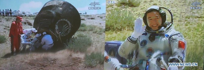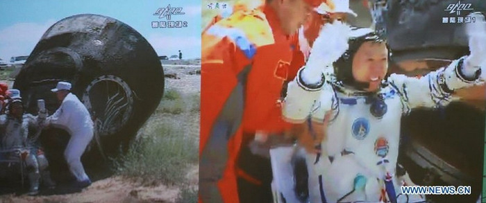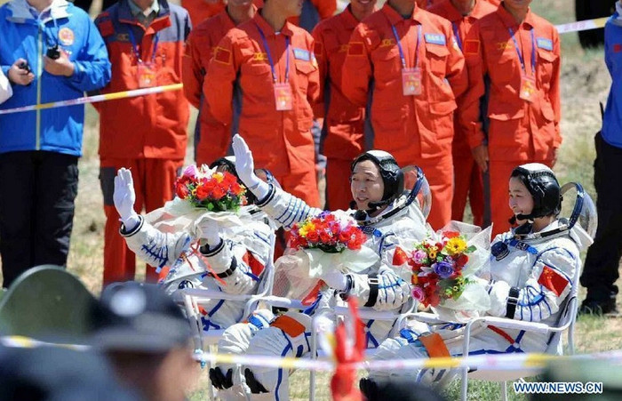 | Các phi hành gia trên tàu vũ trụ Thần Châu-9 đã cất cánh vào ngày 16/6 và đặt chân trở lại Trái Đất lúc khoảng 10 giờ sáng theo giờ Trung Quốc. |