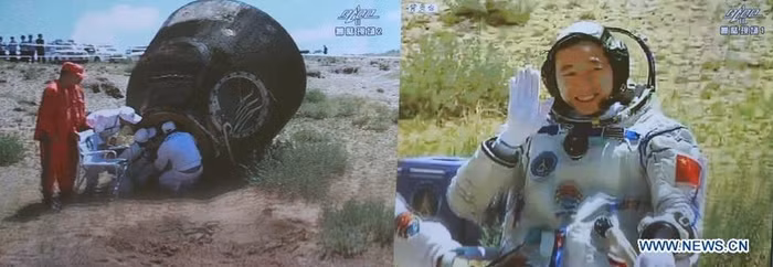 | Hình ảnh trở về của họ được phát trên kênh CCTV cho thấy các phi hành gia đều có tình trạng sức khoẻ tốt. |