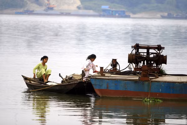 | Chèo thuyền dạo sông Hồng cũng là một... thú vui chỉ có trẻ em bãi giữa mới có |