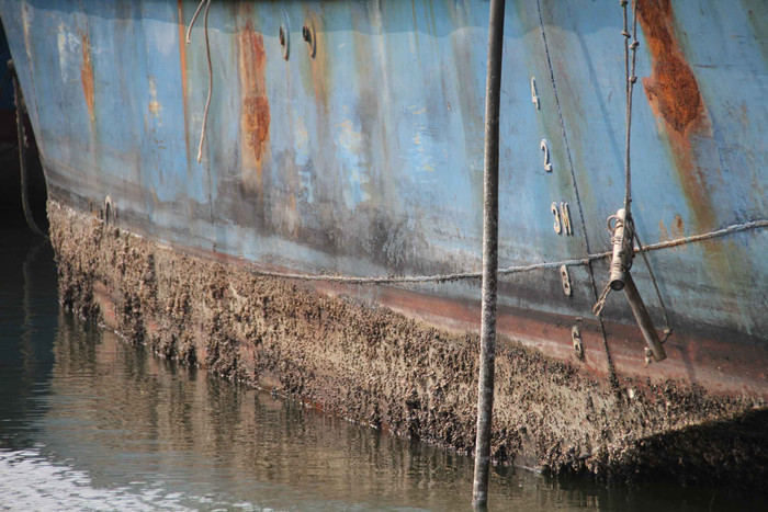 | ...phía dưới thân tàu chạm nước có lớp hà bám chặt. |