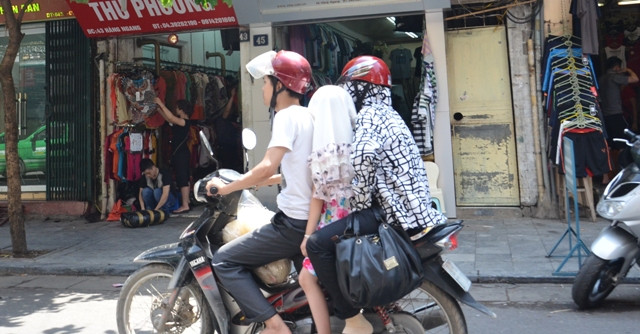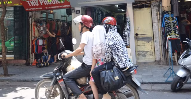 | Thay vì đội mũ bảo hiểm thì người phụ nữ này dùng áo đội lên đầu để chống nắng. |