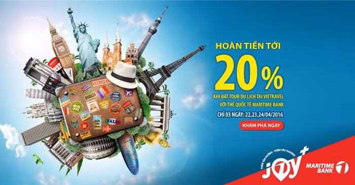 Tiếp nối thành công của những chương trình khuyến mại đặc biệt trong hệ thống Ưu đãi JOY+, đón đầu mùa du lịch năm 2016, Maritime Bank phối hợp cùng Vietravel thực hiện chương trình siêu ưu đãi khi khách hàng đặt tour và thanh toán bằng thẻ Maritime Bank MasterCard tại các đại lý của Vietravel trên toàn quốc: