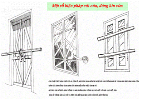Bịt kín cửa và các khe cửa, cửa càng kín gió thì chống bão, áp thấp nhiệt đới càng tốt, vì vậy phải đóng kín cửa để tránh gió thổi tốc vào nhà. Nhà kiên cố vẫn có thể bị tàn phá, cho dù không bị sập.