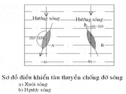 ·Khi chạy xuôi theo hướng sóng, để cho tàu thuyền giảm bớt sức đập của sóng thì điều chỉnh hướng đi của tàu thuyền đối với hướng sóng ở góc mạn phải khoảng 150 - 160 độ (vị trí A sơ đồ). Trong trường hợp tàu chạy ngược sóng, góc lệch khoảng 20 - 30 độ (vị trí B sơ đồ);