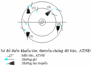 Khi tàu thuyền nằm ở nửa bão, áp thấp nhiệt đới bên phải thì điều khiển cho tàu thuyền chạy ngược gió, sao cho gió thực thổi vào mũi tàu thuyền lệch mạn phải một góc 30 - 45 độ (theo các vị trí 1, 2 sơ đồ), giữ cho tàu thuyền chạy theo hướng đó cho tới khi thoát ra khỏi vùng nguy hiểm;