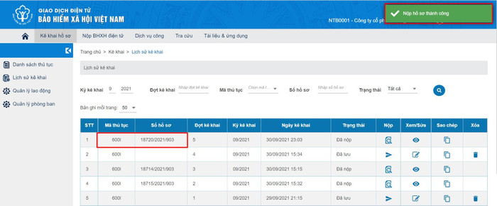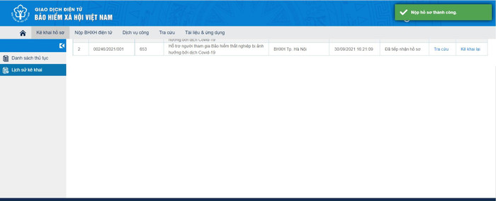 Sau khi thực hiện xác nhận thành công, hệ thống sẽ thông báo nộp hồ sơ thành công. Như vậy là hồ sơ của người lao động đã được gửi đến cơ quan Bảo hiểm xã hội thành công.