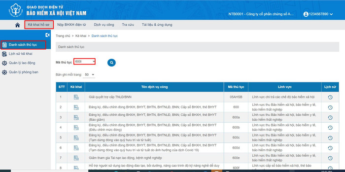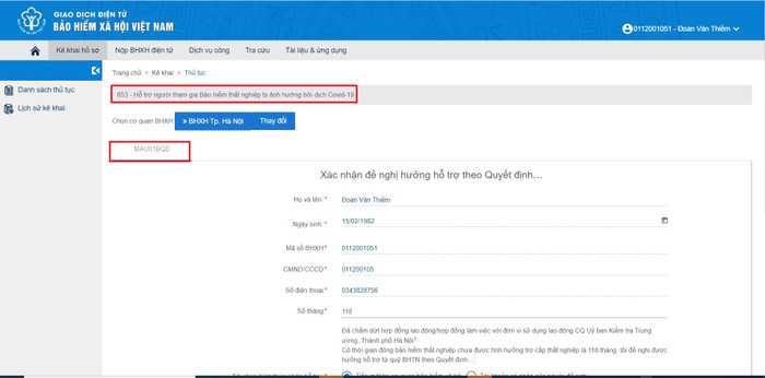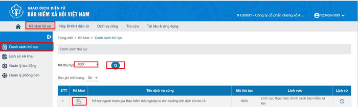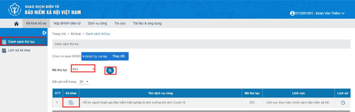 Bước 3: Tại màn hình: “Danh sách thủ tục”, chọn mã thủ tục “653 - Hỗ trợ người tham gia Bảo hiểm thất nghiệp bị ảnh hưởng bởi dịch Covid-19” và chọn Kê khai.