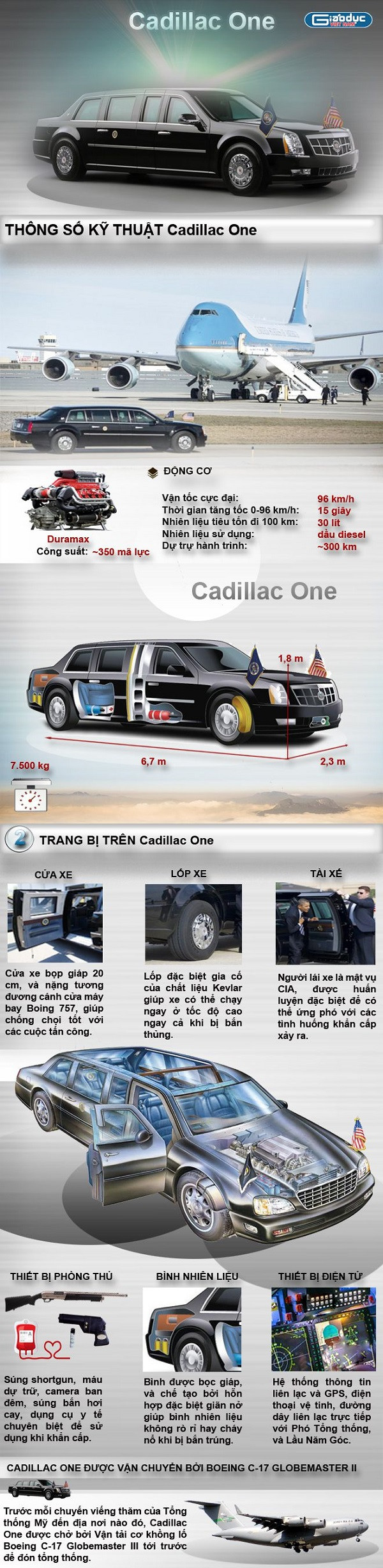 Cùng xem chi tiết siêu xe mệnh danh là xe tăng mặt đất của Tổng thống Mỹ Barack Obama qua infographic dưới đây: