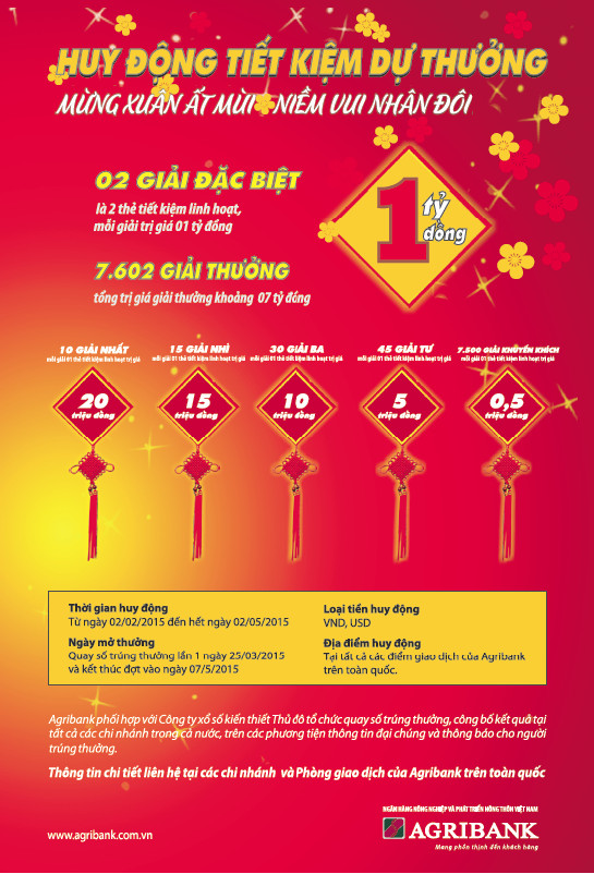 Trước đó, nhằm đáp ứng nhu cầu của khách hàng gửi tiền và tăng cường huy động nguồn vốn ổn định để đáp ứng nhu cầu cho vay, Agribank tổ chức đợt huy động tiết kiệm dự thưởng “Mừng xuân Ất Mùi - Niềm vui nhân đôi” trên phạm vi toàn quốc với lãi suất và cơ cấu giải thưởng hấp dẫn gồm: 2 giải đặt biệt, mỗi giải 1 sổ tiết kiệm linh hoạt trị giá 1 tỷ đồng và 7.600 giải thưởng khác với tổng giá trị khoảng 7 tỷ đồng.