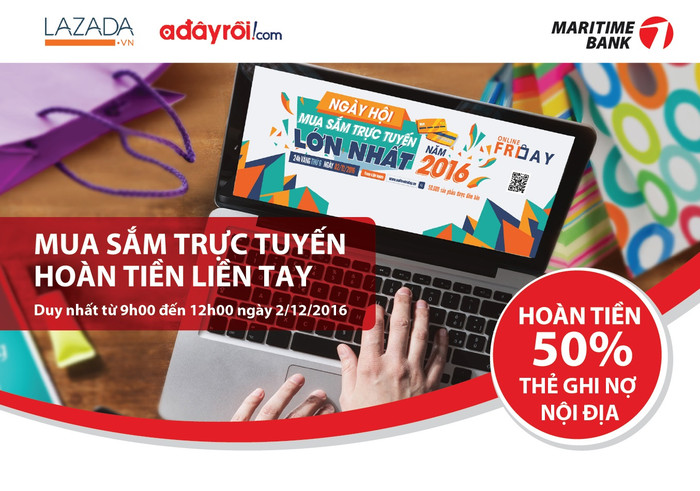 Nắm bắt nhu cầu mua sắm cuối năm của khách hàng cũng như hưởng ứng sự kiện “Ngày hội mua sắm trực tuyến lớn nhất năm 2016 – Online Friday”, Maritime Bank đặc biệt dành tặng khách hàng là chủ thẻ ghi nợ nội địa (thẻ ATM) chương trình “Mua sắm trực tuyến – Hoàn tiền liền tay” – Hoàn tiền 50% (tối đa 200.000 đồng) khi mua sắm tại 2 website thương mại điện tử: Lazada.vn và Adayroi.com.