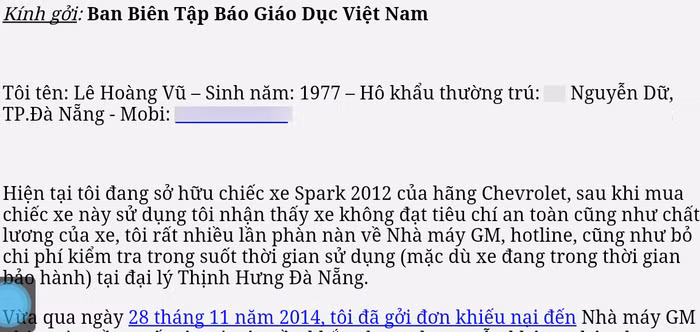 | Đơn khiếu nại anh Lê Hoàng Vũ gửi GM Việt Nam |