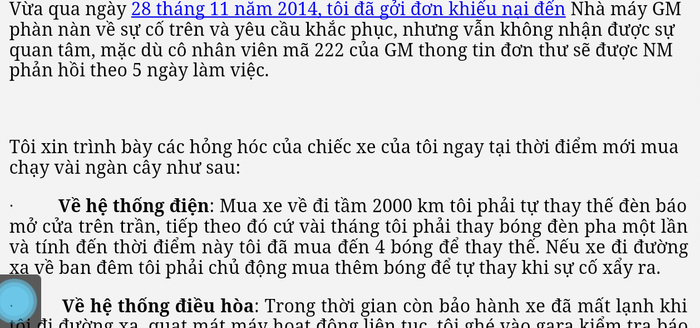 “Tôi rất nhiều lần phàn nàn về Nhà máy GM, hotline, cũng như bỏ chi phí kiểm tra trong suốt thời gian sử dụng (mặc dù xe đang trong thời gian bảo hành) tại đại lý Thịnh Hưng Đà Nẵng. Vừa qua ngày 28/11, tôi đã gởi đơn khiếu nại đến Nhà máy GM phàn nàn về sự cố trên và yêu cầu khắc phục, nhưng vẫn không nhận được sự quan tâm, mặc dù cô nhân viên mã 222 của GM thông tin đơn thư sẽ được Nhà máy phản hồi theo 5 ngày làm việc nhưng đến nay vẫn bặt vô âm tín”, anh Vũ trao đổi với phóng viên Báo GDVN.