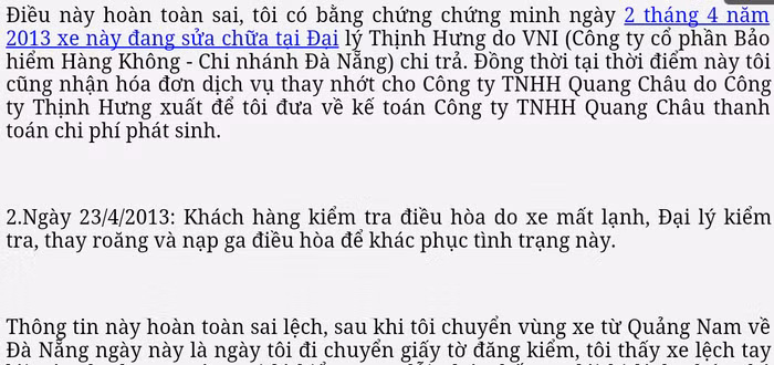 Anh Vũ khẳng định điều này hoàn toàn sai và có bằng chứng chứng minh rằng ngày 2/4/2013 chiếc xe này đang sửa chữa tại Đại lý Chevrolet Đà Nẵng là Công ty TNHH Ô tô Thịnh Hưng do VNI (Công ty cổ phần Bảo hiểm Hàng Không - Chi nhánh Đà Nẵng) chi trả. Đồng thời tại thời điểm này, anh Vũ cũng nhận hóa đơn dịch vụ thay nhớt cho Công ty TNHH Quang Châu do Công ty Thịnh Hưng xuất để anh Vũ đưa về kế toán Công ty TNHH Quang Châu thanh toán chi phí phát sinh.
