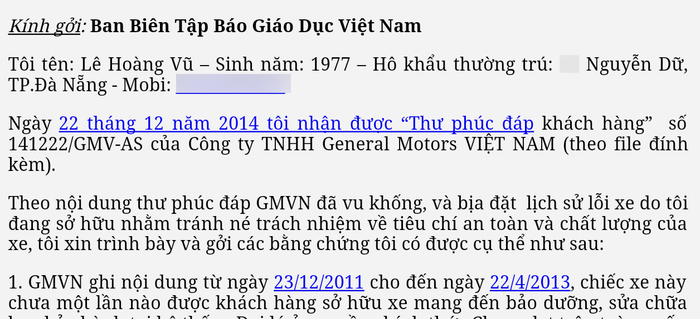 Theo đơn anh Lê Hoàng Vũ gửi cho Báo Giáo dục Việt Nam, ngày 22/12 anh Vũ nhận được “Thư phúc đáp khách hàng” số 141222/GMV-AS của Công ty TNHH General Motors Việt Nam.