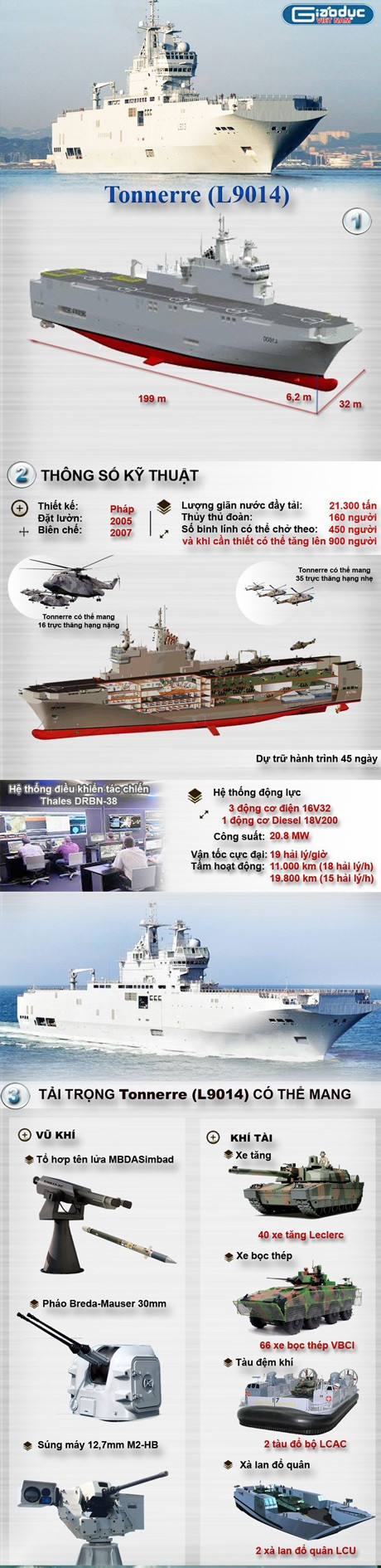 Với thiết kể ưu việt, khả năng tác chiến điện tử hiện đại, mang được nhiều trực thăng cùng khả năng chuyên chở cực lớn, chiến hạm BPC Tonnerre này đóng vai trò nòng cốt trong lực lượng hải quân Pháp. Cùng xem thông số về chiến hạm này qua Inforgraphic dưới đây: