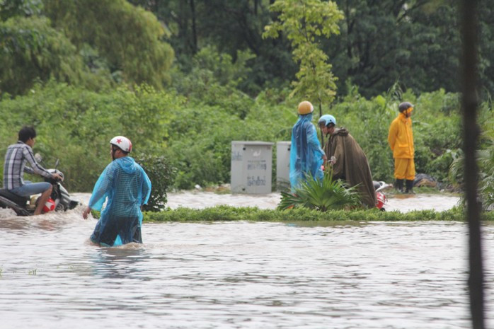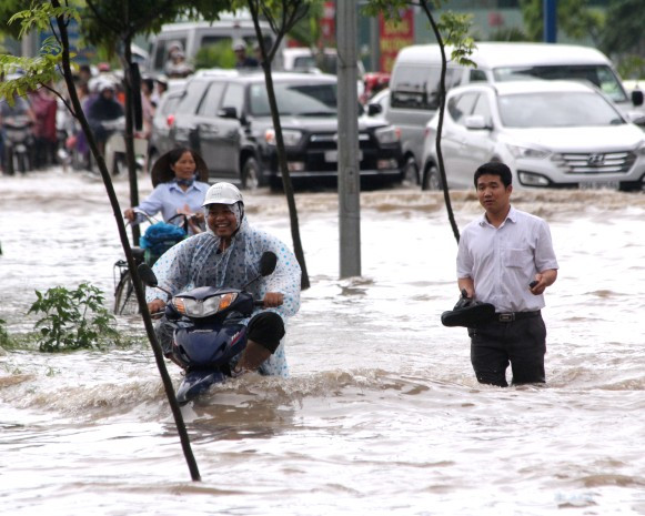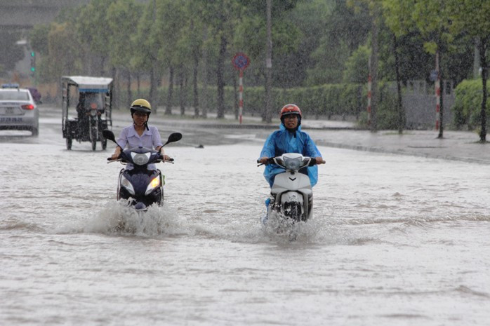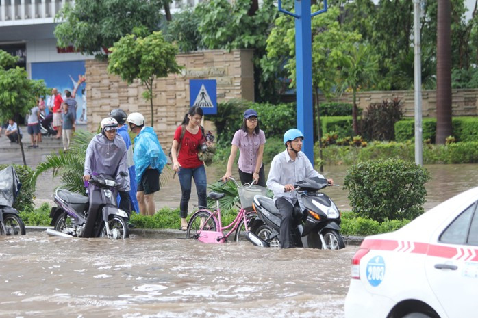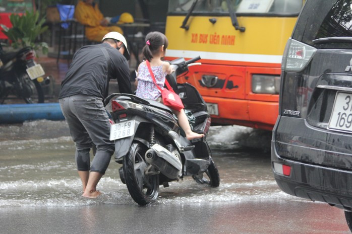 | Dắt xe là cách an toàn nhất khi đi qua những khu nước ngập |