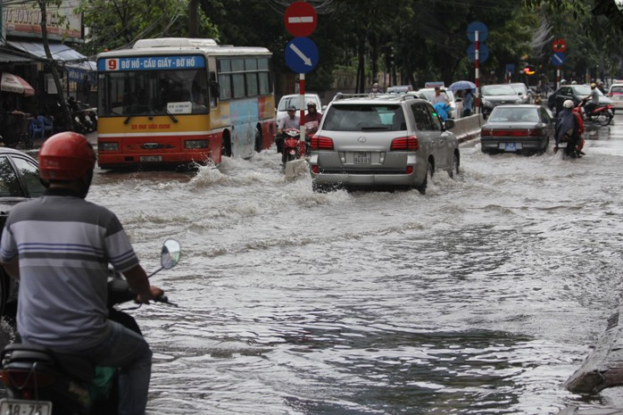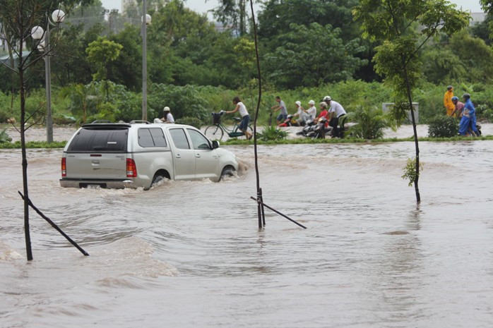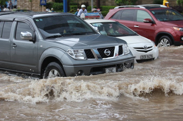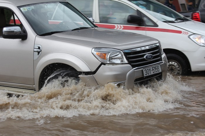 | Ô tô chạy qua, nhiều chỗ nước ngập sâu đến gần hết bánh |