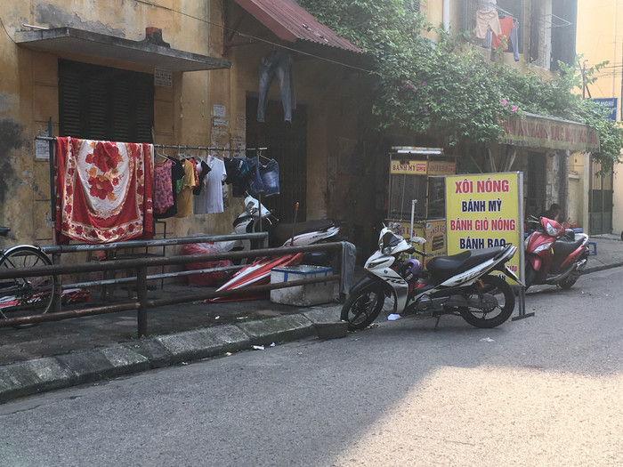 Còn ký túc xá 4B khu vực tầng 1 cũng được cho thuê làm các ki-ốt kinh doanh. Những cửa hàng này căng bạt, bày hàng, bàn ghế ngổn ngang, thậm chí phơi cả quần áo…