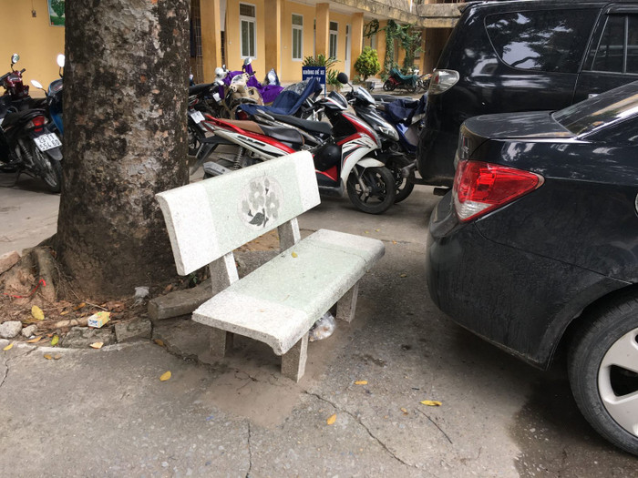 | Những chiếc ghế đá trở lên vô duyên và không thể ngồi được vì chật kín xe ô tô, xe máy để sát. Ảnh: Vũ Phương. |