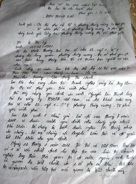 | La đơn đãm nước mắt của Chị Lê Thị Lý cầu cứu chi hội phụ nữ ở địa phương |