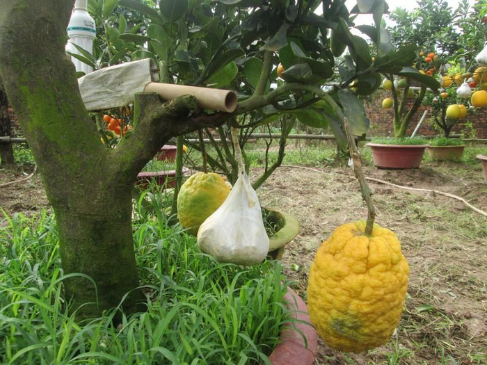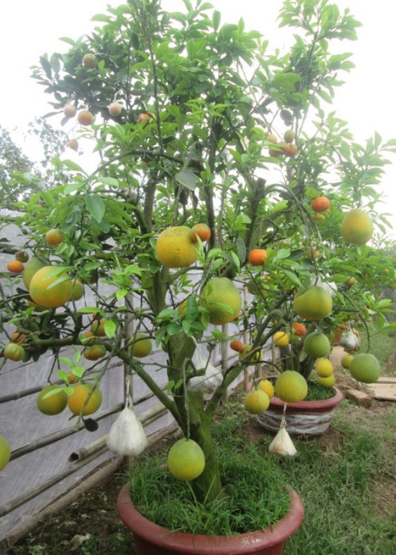 | Theo ông Giáp, để các loại quả chín cùng một thời điểm vào dịp tết, tháng 4 ông bắt đầu ghép quả bưởi, tháng 5 ghép quả cam, chanh đào và còn lại loại quả Phật thủ, quất, quýt được ông ghép vào tháng 8 (ảnh HC) |
