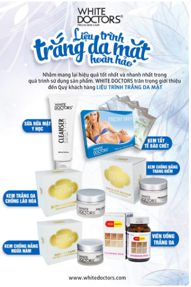 * Ban ngày ngoài việc dùng kem dưỡng trắng Skin Lightening, thoa thêm một lớp chống nắng Daily Uv care - White Doctors chống nắng bảo vệ da (vì khi dưỡng trắng làn da xấu được thay bằng làn da đẹp nhưng lúc này da yếu dễ bị tổn thương do ánh nắng thế nên việc dùng chống nắng là bắt buộc).