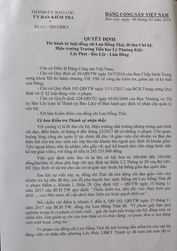 Ủy ban Kiểm tra Thành ủy Bảo Lộc chỉ ra rằng, trên cương vị là Bí thư Chi bộ, Hiệu trưởng nhà trường nhưng trong quá trình chỉ đạo, điều hành từ tháng 6 - 12/2017, ông Thái đã chủ quan, buông lỏng công tác quản lý tài chính để cho 16 giáo viên chủ nhiệm và Ban đại diện hội cha mẹ học sinh các lớp thu các khoản thu ngoài quy định với tổng số tiền là hơn 293 triệu đồng.