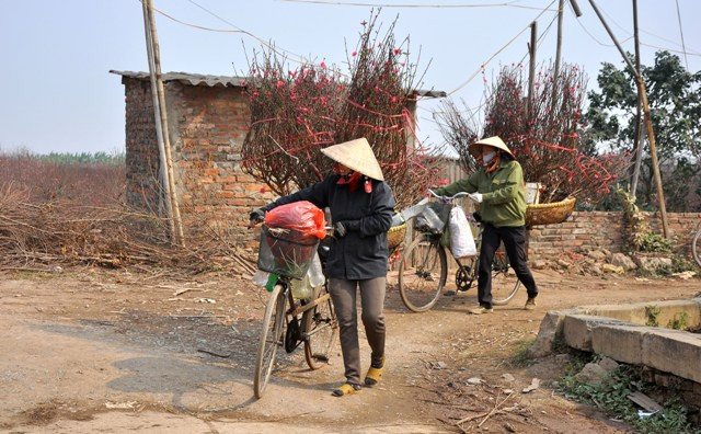 | Chị Trần Thị Oanh (Việt Yên, Bắc Giang) đã hơn 3 năm buôn đào dịp Tết ở Hà Nội chia sẻ: “Tôi cùng mấy chị em trong làng, cứ đến cuối năm là lại về vườn đào này mua cành đi xuống phố bán. Mỗi cành đào chúng tôi bán ra cũng lãi được 20. 000 - 30.000 đồng”. |